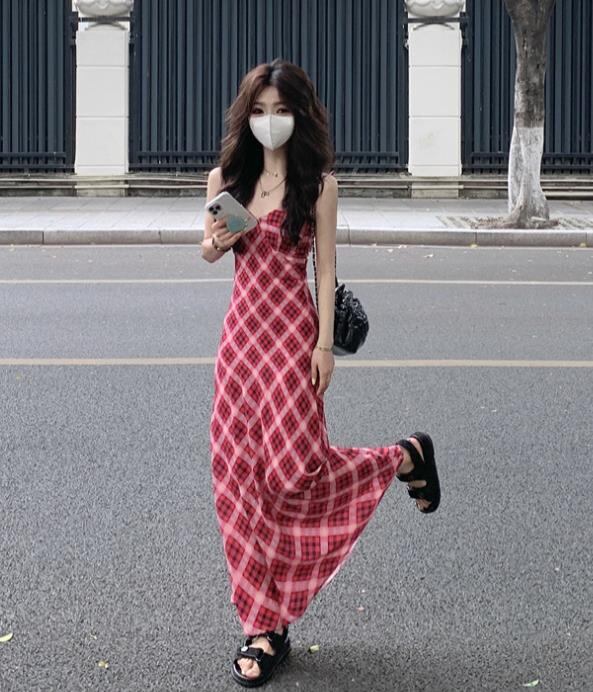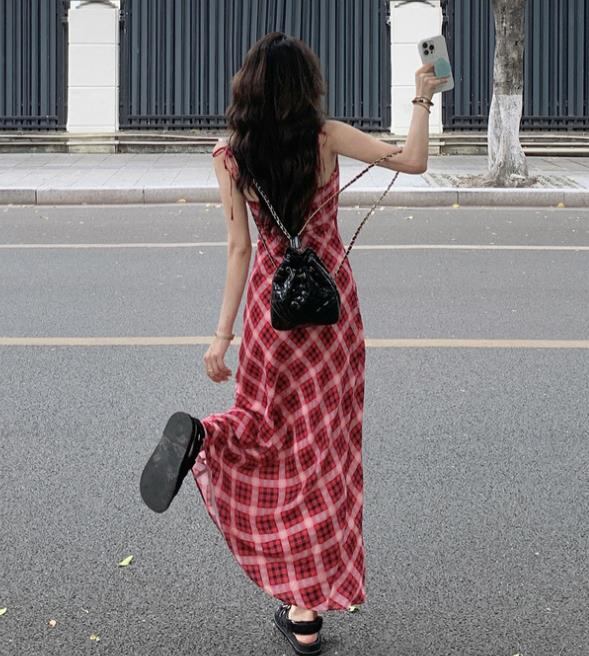 2024春夏新作 女 レディース 袖なし チェック柄 吊りスカート ロング ワンピース 台型スカート