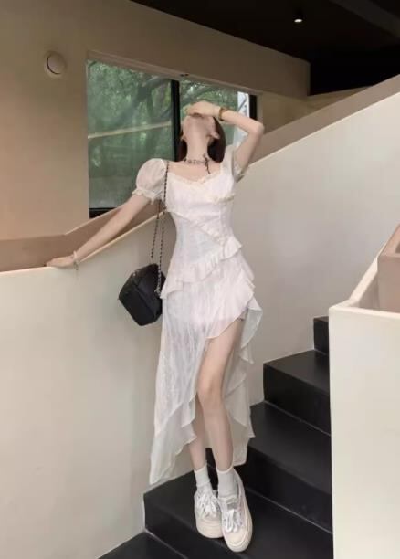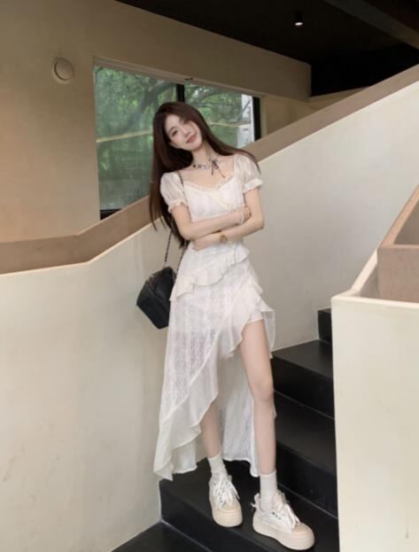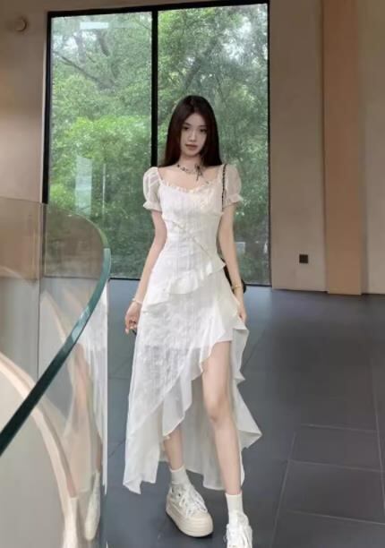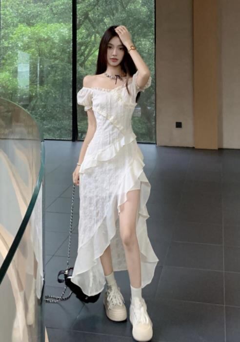 2024春夏新作 女 レディース ハイウエスト 半袖 ロング ワンピース 台型スカート