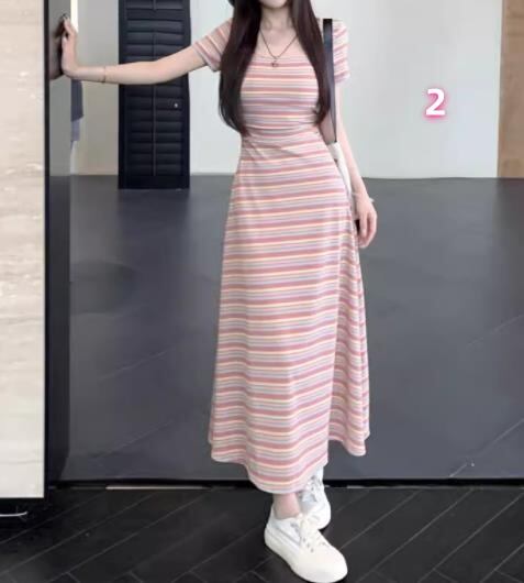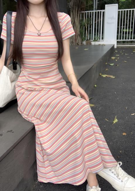春夏新作 女 レディース ハイウエスト 半袖 ボーダー柄 ミニ ワンピース ドレス 台型スカート