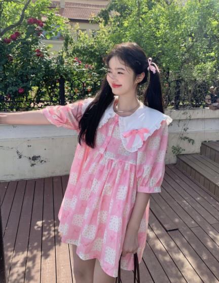 春夏新作 女 レディース ハイウエスト 半袖 チェック柄 ミニ ワンピース ドレス 台型スカート