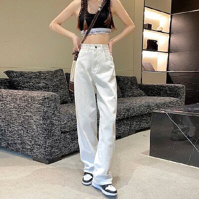 即納ホワイト ワイドパンツ レディース ハイウェスト 春 着痩せ ストレートパンツ ジーンズ
