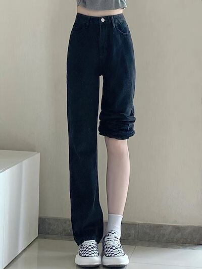 脚長効果抜群!ハイウエストパンツ ブラックストレートジーンズ レディース 2024年秋新作 ドレープワイドレッグ