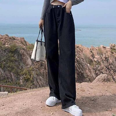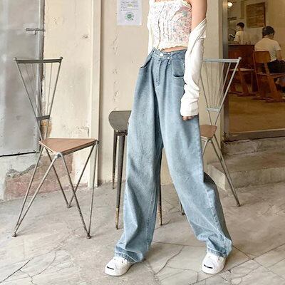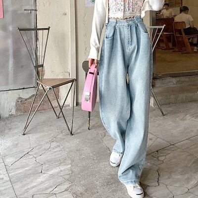 ワイドパンツ 2024新作 百掛け ライトブルー ジーンズ 着痩せ ストレート ワイドパンツ