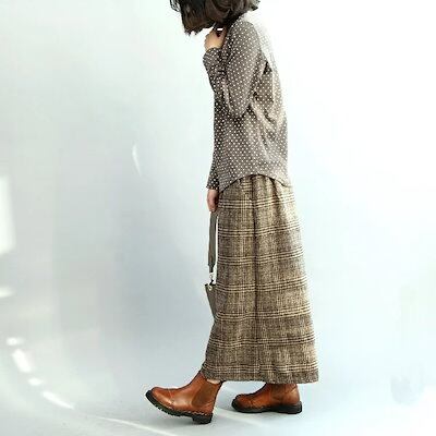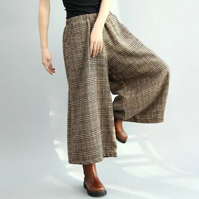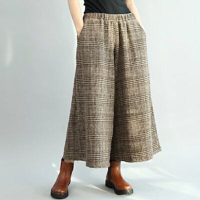 ワイドパンツ レディース ガウチョパンツ 7分丈 チェック柄 ウェストゴム 春ボトムス ズボンゆったり 大きいサイズ 秋冬 厚手 ロング ハイウエスト 体型カバー カジュアルコーデ 大人 おしゃれ き