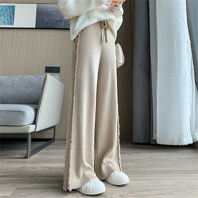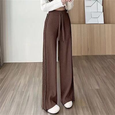 パンツ レディース リブニット きれいめ ニット ストレッチ 秋 冬 ワイドパンツ 暖か ストレート ウエストゴム リブ イージーワイドパンツ ボトムス 楽ちん 厚手 ゆったり ロング 大きいサイズ