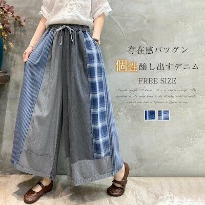 デニム ワイドパンツ レディース デニムワイドパンツ ロング 春 夏 秋 フレアパンツ ガチョウパンツ 大きいサイズ リラックスパンツ デニムパンツ ボトムス 体型カバー ウエストゴム バイカラー ス