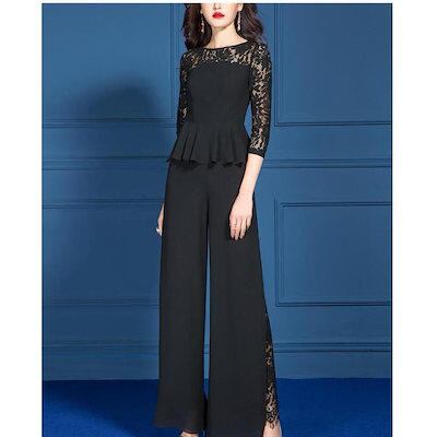 セットアップ エレガント レディース ママ 上品 キレイめ オシャレ レース ブラック 無地 トップス+ワイドパンツ 半袖 春夏秋 着痩せ 上下セット 通勤 パーティ