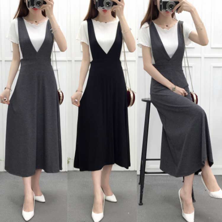 ジャンパースカート サロペット 深Vネック ワンピース ロング ジャンスカ レディース ノ