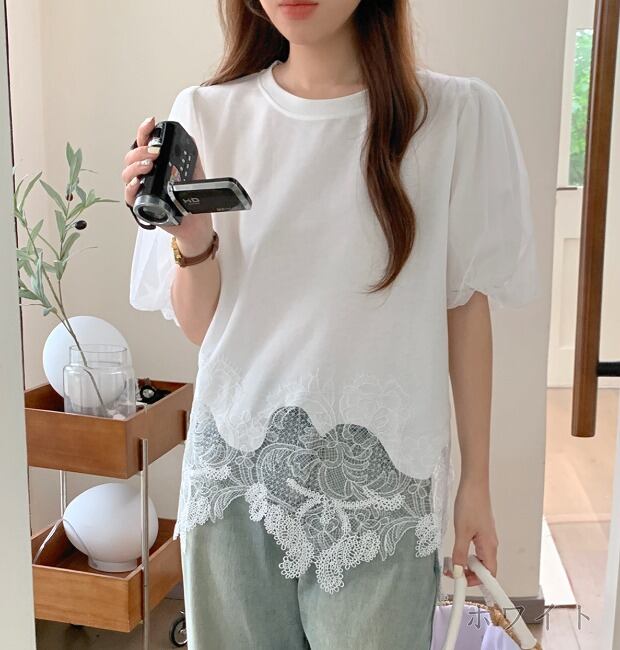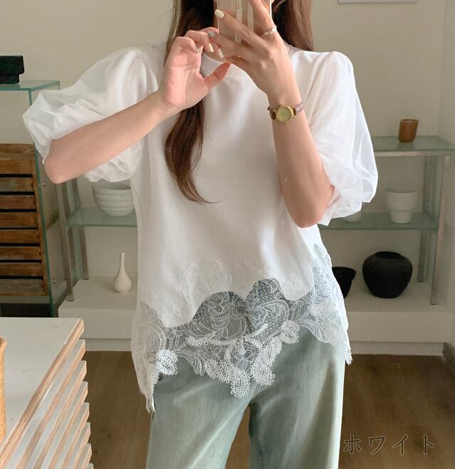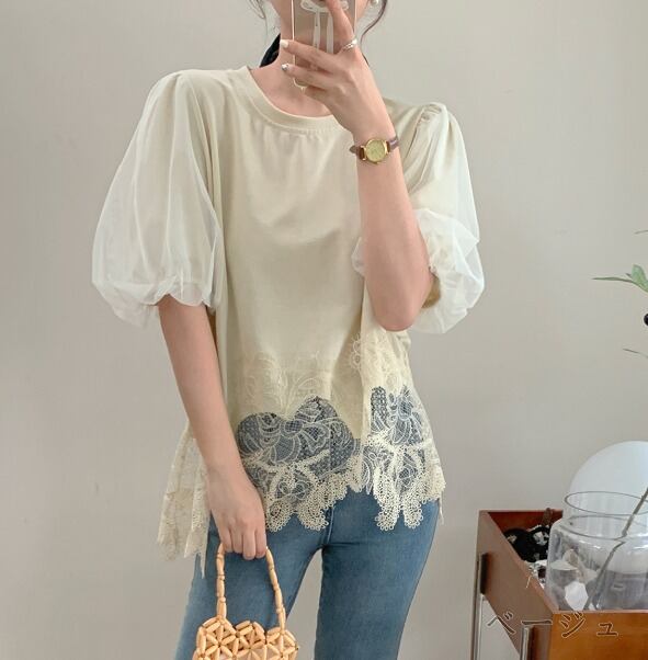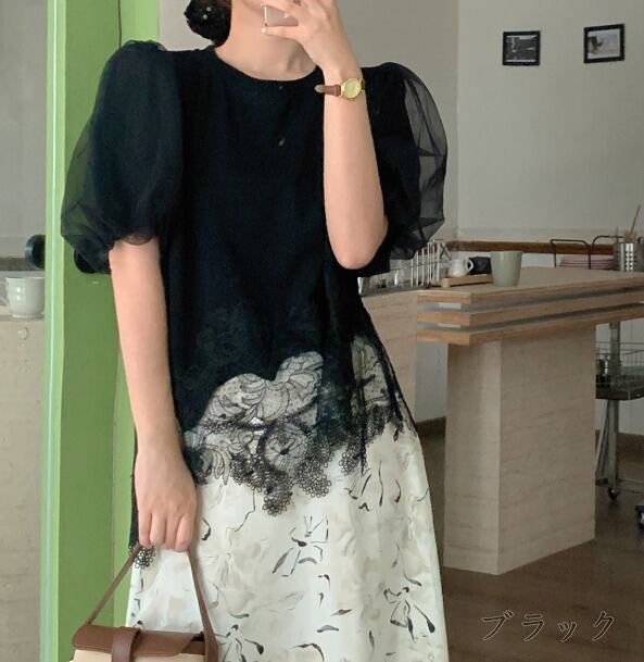 全3色 半袖Tシャツ ボリューム袖 切り替え 体型カバー 着痩せ sweet系