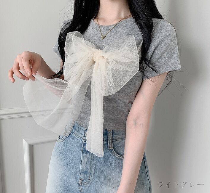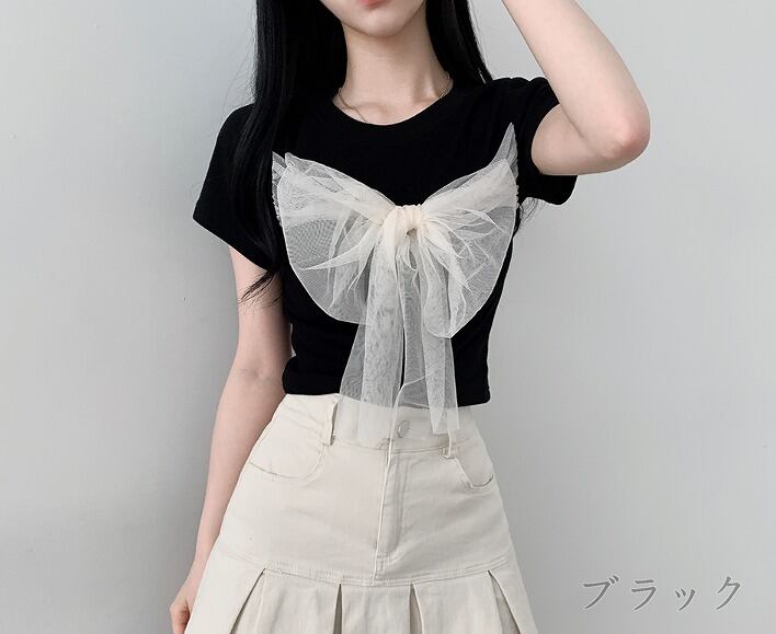 全3色 半袖Tシャツ フェイク チュール 切り替え スリム 着痩せ シンプル