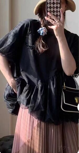 全2色 半袖Tシャツ フリル 切り替え 体型カバー 着痩せ sweet系