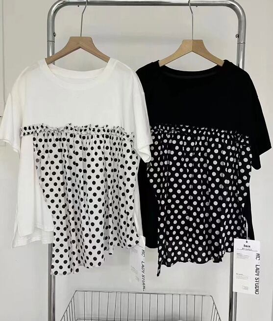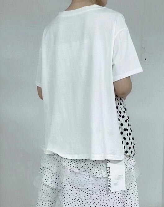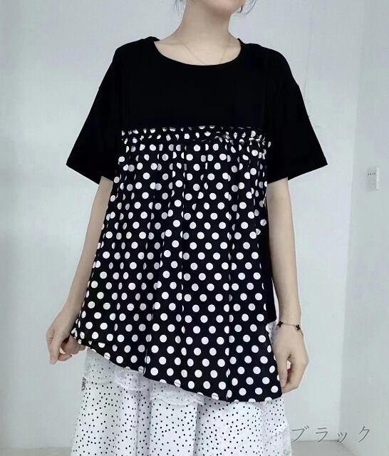 全2色 半袖Tシャツ フェイク 切り替え バイカラー フリル ドット柄 カジュアル