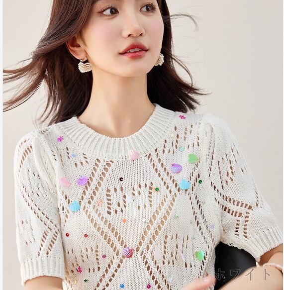 ニット 半袖 透け編み 体型カバー 着痩せ カットソー sweet系