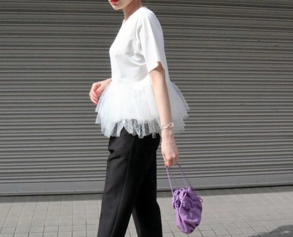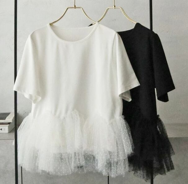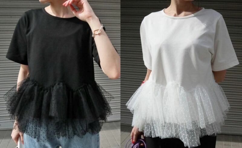 全2色 半袖Tシャツ フリル 切り替え 体型カバー 着痩せ チュール sweet系