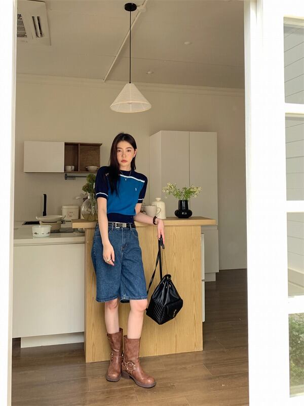 ニット 半袖 切り替え バイカラー スリム 着痩せ シンプル