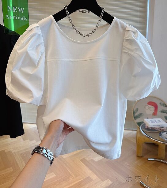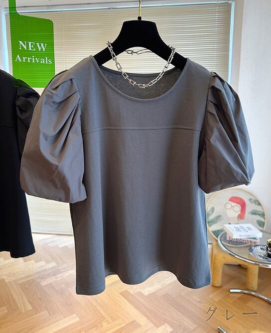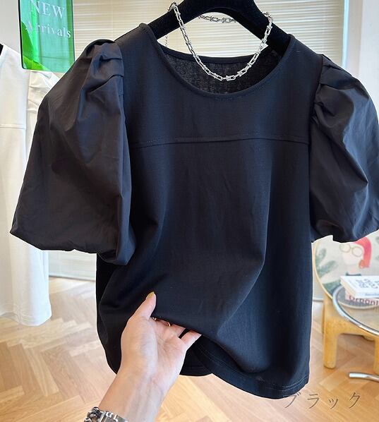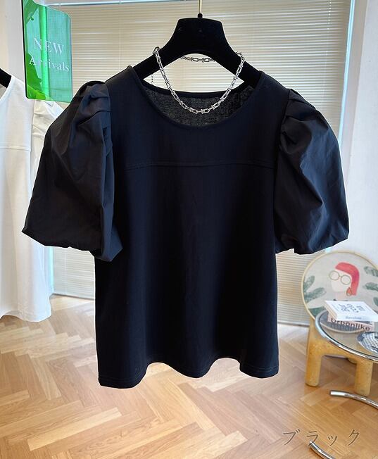 全3色 半袖Tシャツ ボリューム袖 切り替え 体型カバー 着痩せ 【大きいサイズあり】