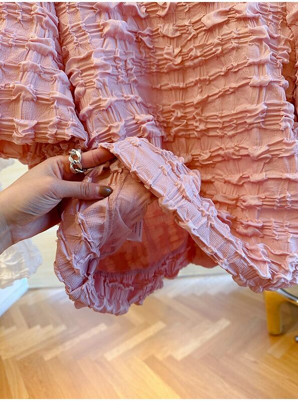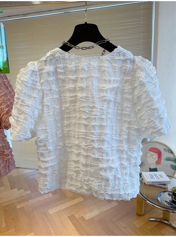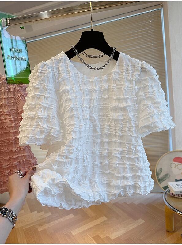 全2色 半袖Tシャツ シャーリング ボリューム袖 切り替え 体型カバー 着痩せ 【大きいサイズあり】