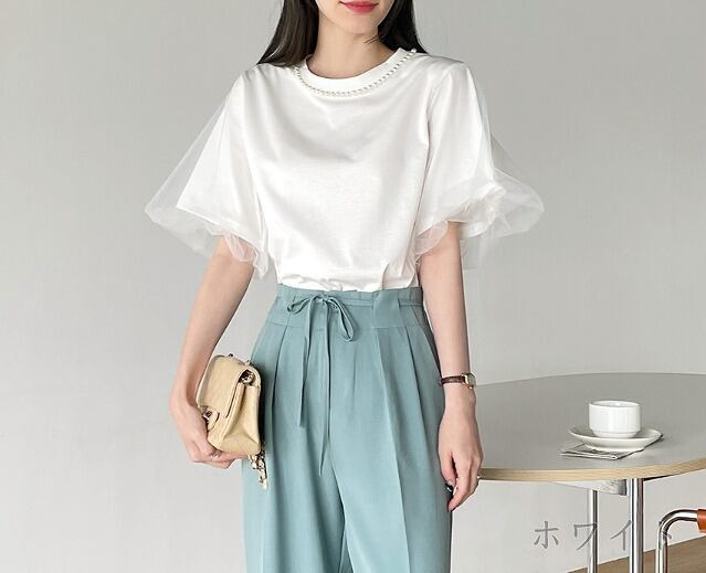 全2色 半袖Tシャツ チュール ボリューム袖 切り替え 体型カバー 着痩せ シンプル