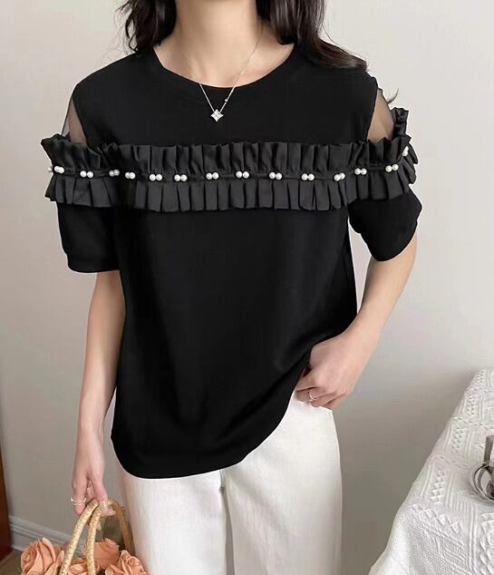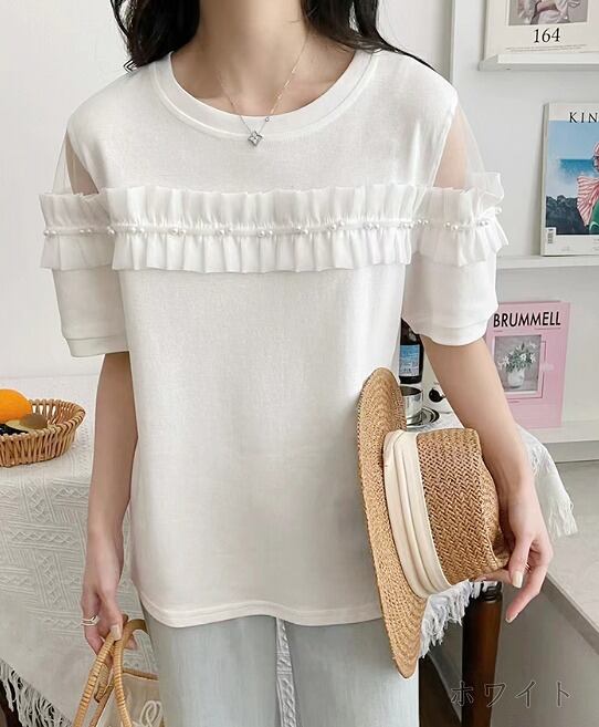 全2色 半袖Tシャツ フリル 切り替え 体型カバー 着痩せ シンプル