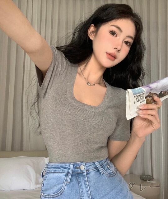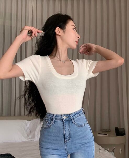 全4色 半袖Tシャツ Uネック 切り替え スリム 着痩せ シンプル