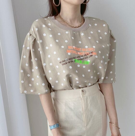 全4色 半袖Tシャツ 切り替え バイカラー 体型カバー 着痩せ ドット柄 シンプル カジュアル