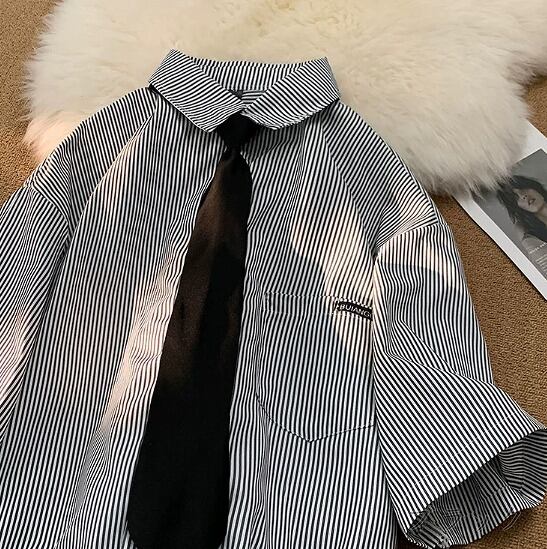 全2色 半袖シャツ 切り替え バイカラー 体型カバー 着痩せ ストライプ柄 原宿系