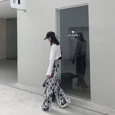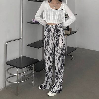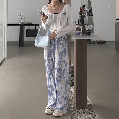 2色 パンツ レディース ワイドパンツ ルーズ おしゃれ リラックス ボトムス ズボン カジュアル 柄 ハイウエスト ダイダイ 絞り染め プリーツ 白 黒 青 おしゃれ 大人可愛い こなれ感 ラフ ゆ