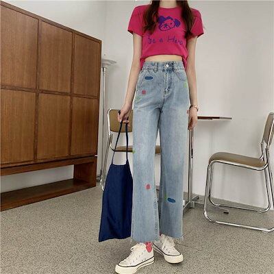 デニム パンツ ロング丈 ジーパン レディース 切りっぱなし ストレート ワイドレッグ ハイウエスト ペイント柄 ペンキ 大人可愛い シンプル カジュアル ジーンズ ボトムス ブルーデニム 淡色 ズボ