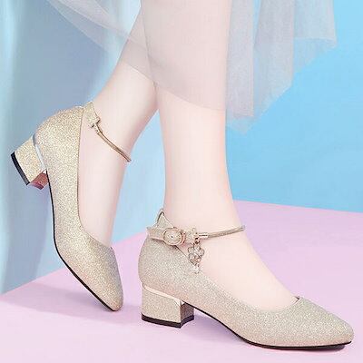パンプス キラキラ ローヒール チャンキーヒール アーモンドトゥ ストラップ アンクルストラップ 上品 ゴージャス ブラック ゴールド 結婚式 ピアノ 発表会 綺麗め パーティー シューズ 靴 イベン