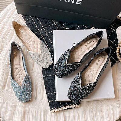 ぺたんこパンプス レディース ぺたんこシューズ キラキラ Vカット 大きいサイズ靴 バレエシューズ カジュアル フラット ローヒール スクエアトゥトゥ 女っぽ 歩きやすい 疲れない カジュアル 美脚
