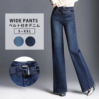 ワイドパンツ デニム レディース 春秋冬 ハイウエスト ジーンズ デニムパンツ ストレッチ 大きいサイズ ゆったり ストレート ジーパン カットオフ ロングパンツ 10分丈 ボトムス シンプル ベルト