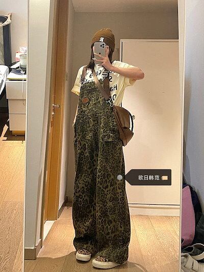 大きいサイズアメリカンヒョウ柄デニムオーバーオールレディース2025レトロゆったりワイドレッグフロアレングスパンツ