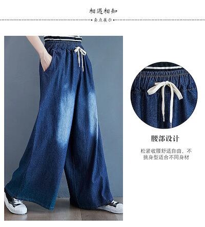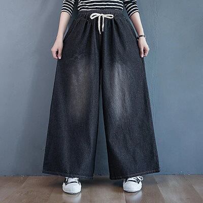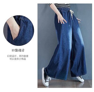 「ファットガール」 秋冬 デニムパンツ ゴム ワイドパンツ ハイウエスト 大きいサイズ ゆったり フレア レディース ロングパンツ
