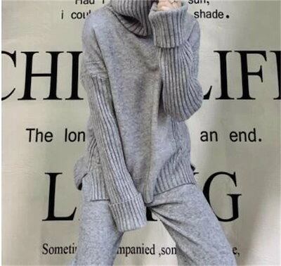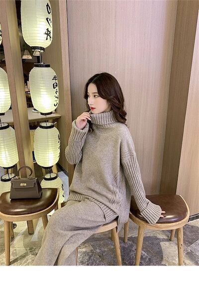 ニット セットアップ レディース セットアップ ニット 上下セット 2点セット パンツスーツ タートルネック ロング丈 プルオーバー ワイドルーズ 通勤 カジュアル シンプル 長袖 ゆったり リブニッ