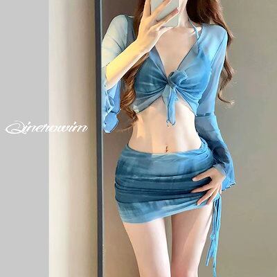 ビキニ水着レディースポリエステルスプリット4ピース長袖ファッションプリントと染色スリムセクシーな温泉水着卸売