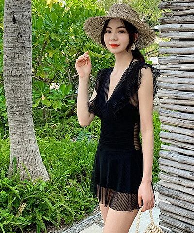 水着レディースワンピースオールインワンフリルレースシアーフレアワンピース水着大きいサイズ体型カバーホルターネックセクシーショートパンツスカートリゾート上品可愛い韓国風韓国ファッション1619