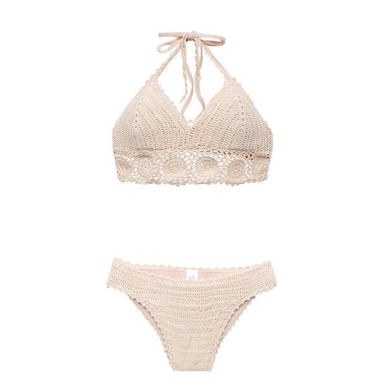 可愛らしいかぎ針編みのニットがフェミニンで、ホルターネックで背中を大胆に美しく見せることができる、セクシーな水着です。ノンワイヤーでカップがついているので、ビーチでのアクティブなシーンでも快適に着ていただくことができます。セパレートタイプの水着なので、スイムウェアとしても、ショートパンツと合わせてビーチやリゾートでのカジュアルウェアとしても、様々なシーンで使える万能なアイテムです。■素材:ニット