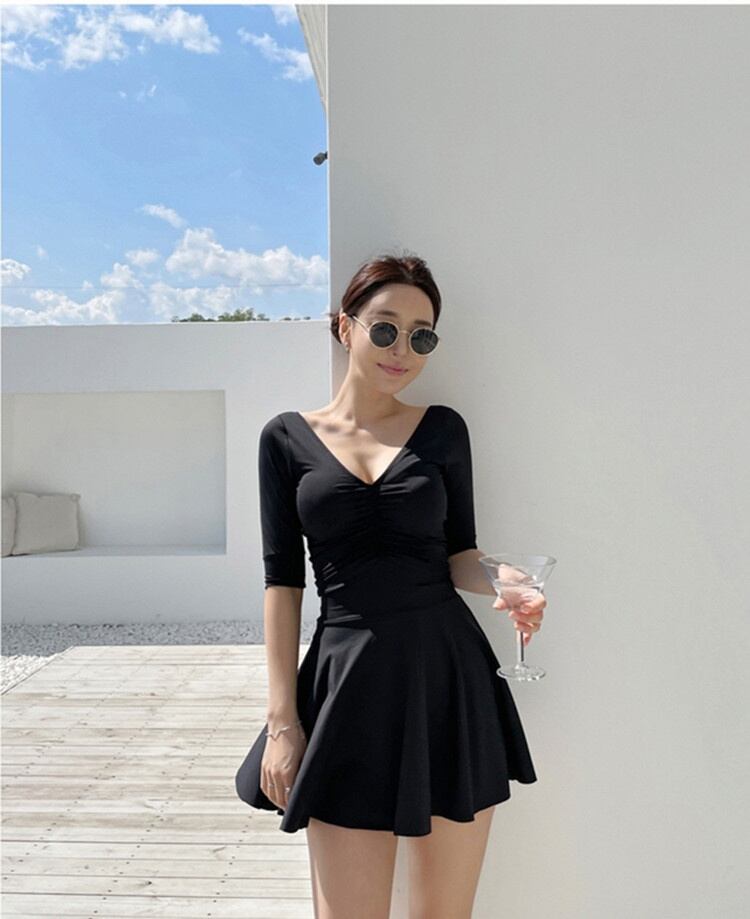 お出かけ 小胸寄せ 水着 Vネック ミニスカート式 2023新品 シンプル 学生 半袖