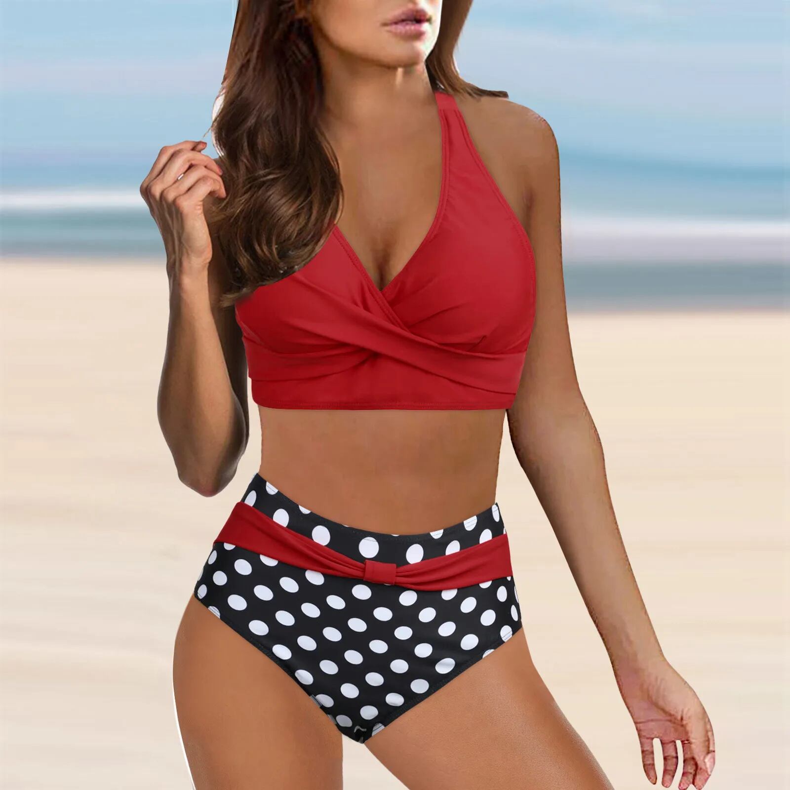女性用プリントビキニセット,ハイウエストプッシュアップビキニ,Vネック水着,女性用体操服,ブロックプリーツ,ホルターネック ビキニ Tシャツ T240618235409_03