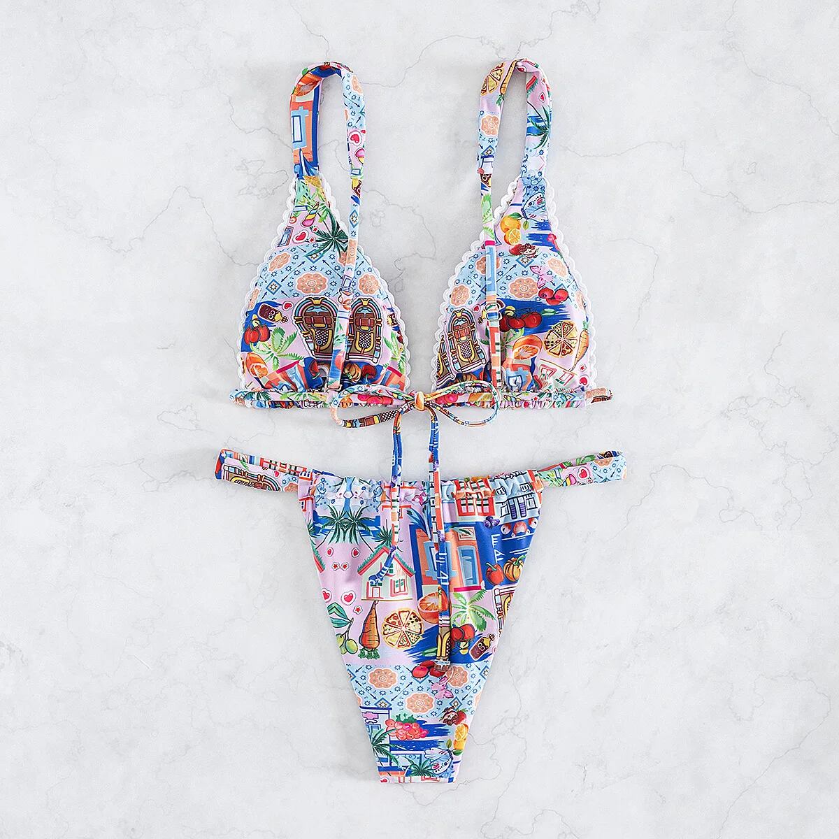 女性のための花柄のマイクロビキニ,ひもとセクシーな磁器の水着,青と白 ビキニ Tシャツ T240618235501_02
