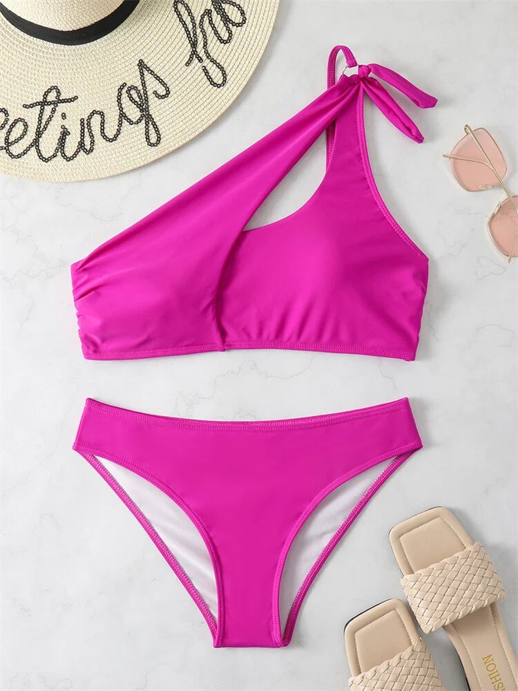 ツーピースの女性用ビキニ,黒の非対称水着,単色,裸の肩,2023 ビキニ Tシャツ T240618235712_03
