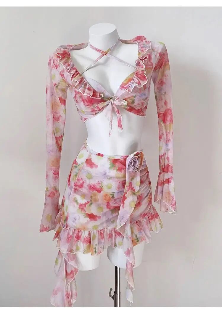 女性用長袖水着,フラウンス付きフロントネクタイ,スカート付きカバー,4ピース水着,バケーションウェア,韓国スタイル ビキニ Tシャツ T240619002601_01