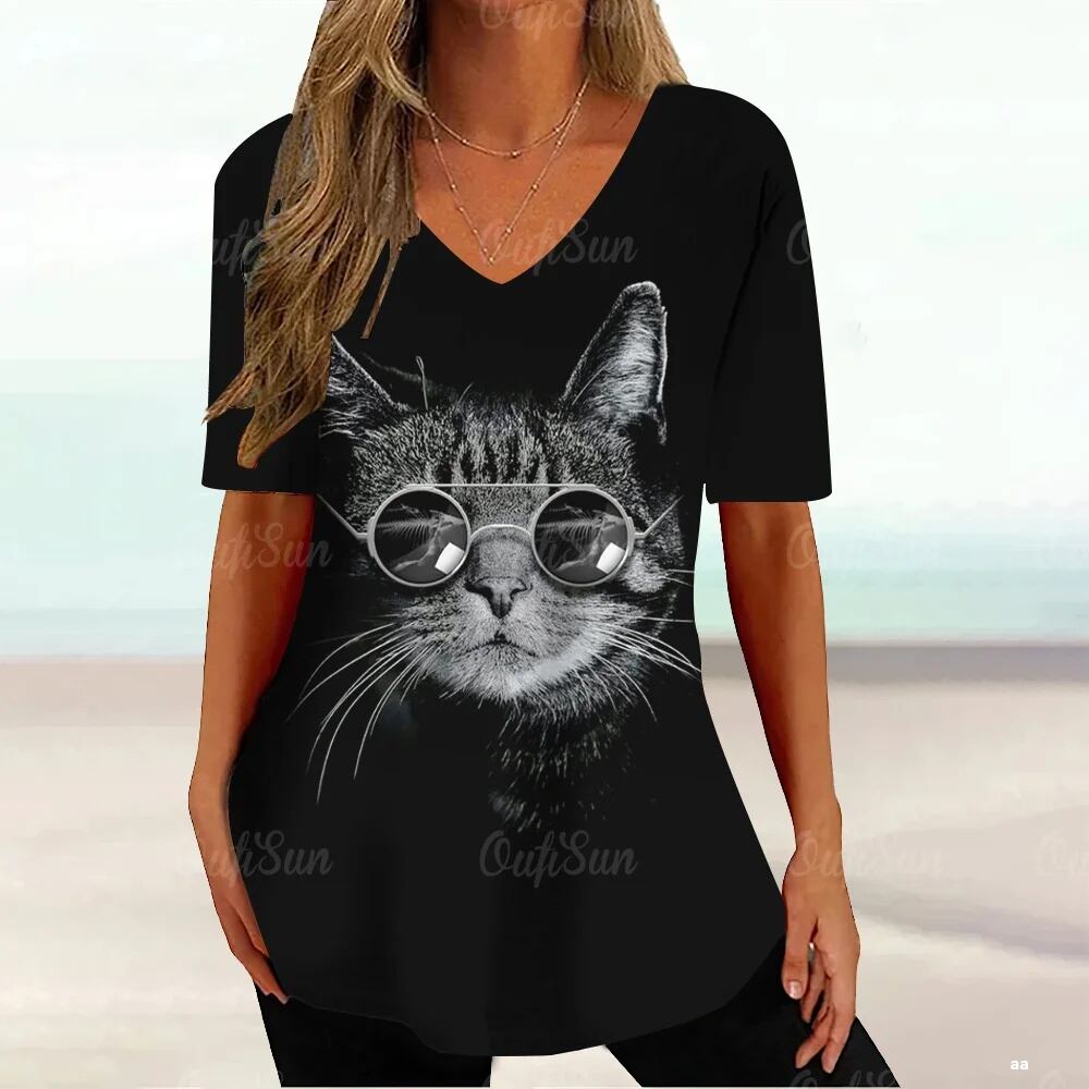 カワイイ 女性の猫の絵が描かれたTシャツ,半袖原宿の夏のトップス,だぶだぶのTシャツ,婦人服 ボトム ボトムス ズボン T240619165035_09
