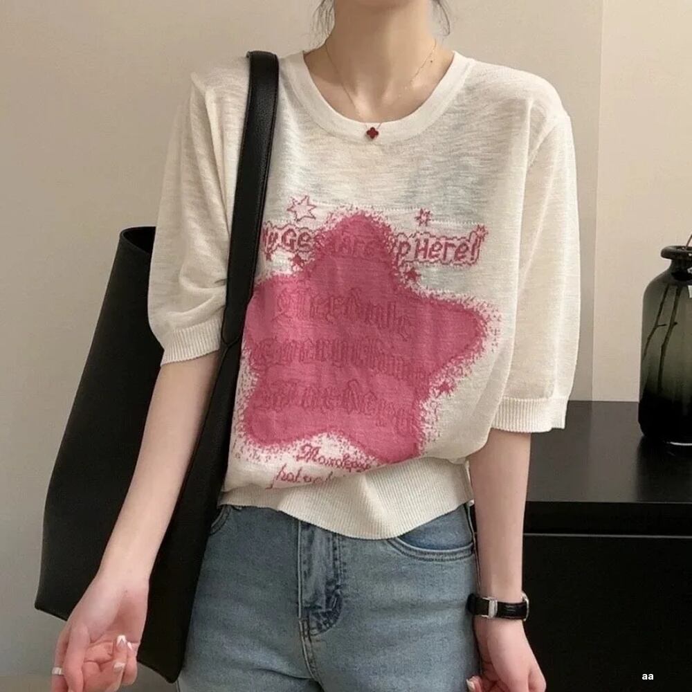 女性用半袖ニットTシャツ,スター付き外国風,半袖,薄手のコットンTシャツ,半袖Tシャツ ボトム ボトムス ズボン T240619165236_02