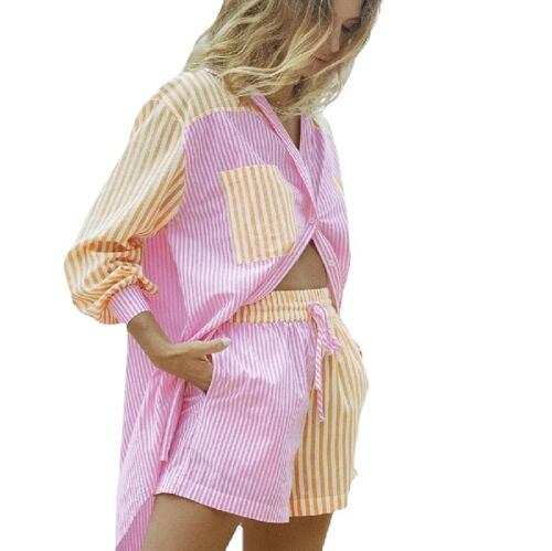女性用ストライプラペル長袖シャツとショーツ,2ピース,春と秋に適しています,2024