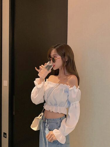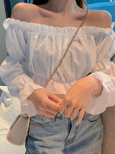 裸の肩,長袖,フラウンス,セクシーなブラウス,白いシャツ,パフスリーブ,単色のチューブトップ,夏