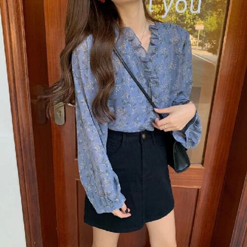 女性のためのエレガントなシルクシフォンシャツ,パフスリーブのエレガントな秋の服,ブループリントカーディガン,10314