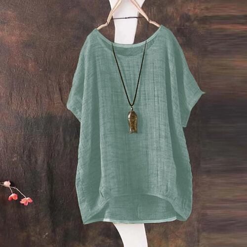 女性用のラージサイズのコットンとリネンのブラウス,女性用の半袖シャツ,十分で快適なトップス,単色,カジュアル