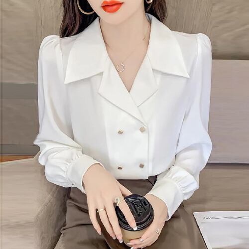 女性用ダブルブレストブラウス,襟付き,長袖,無地,オフィスウェア,カジュアル,シンプル,エレガント