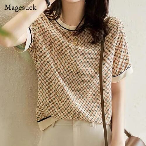 女性用スクエアチェッカーシャツ,アイスシルクトップ,プリントリブブラウス,エレガント,夏,新品,エレガント,18852